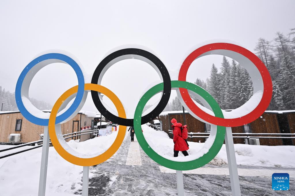 Photo taken on Feb. 3, 2026 shows the Olympic rings at the Cortina D'Ampezzo Olympic & Paralympic Village ahead of the 2026 Milan-Cortina Winter Olympics in Cortina D'Ampezzo, Italy, Feb. 3, 2026. (Xinhua/Lian Yi)
