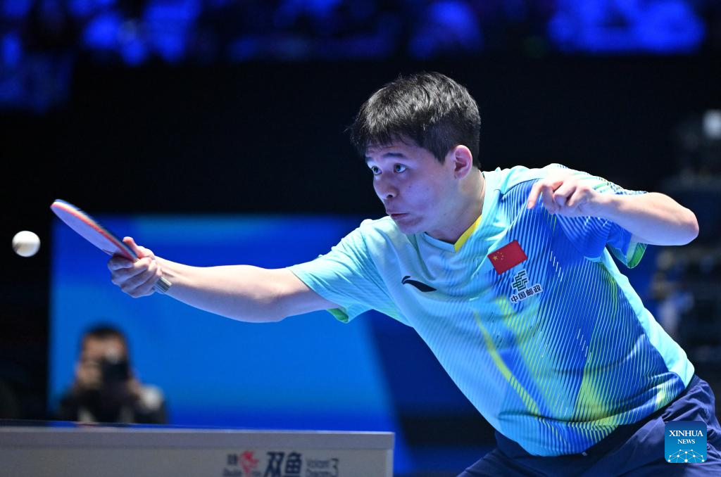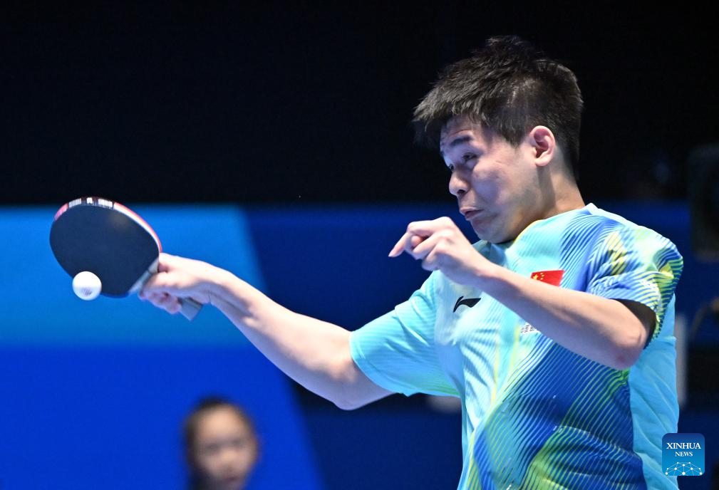 Lin Shidong hits a return during the men's singles group match between Lin Shidong of China and Snehit Suravajjula of India at the ITTF-ATTU Asian Cup Haikou 2026 table tennis tournament in Haikou, south China's Hainan Province, Feb. 4, 2026. (Xinhua/Guo Cheng)