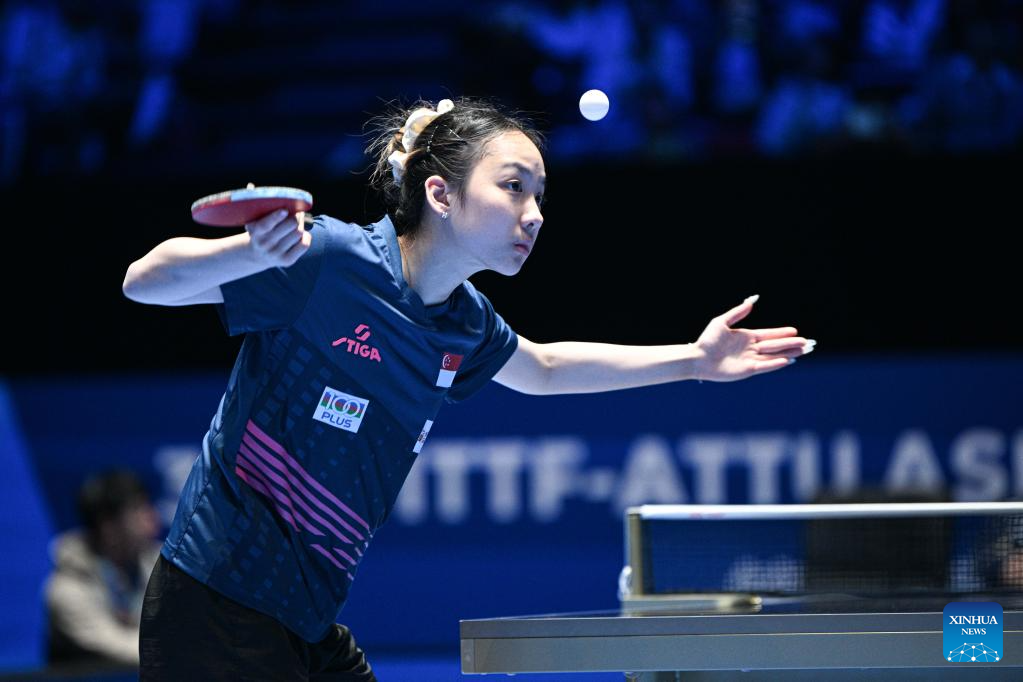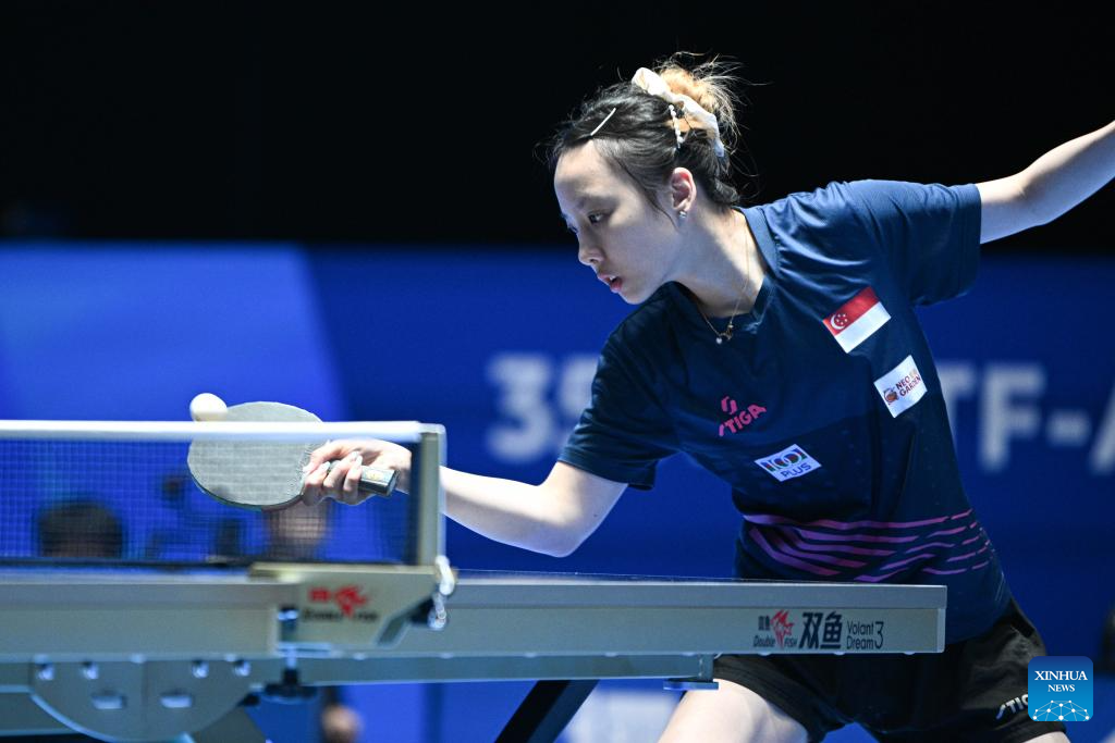 Ser Lin Qian hits a return during the women's singles group match between Wang Yidi of China and Ser Lin Qian of Singapore at the ITTF-ATTU Asian Cup Haikou 2026 table tennis tournament in Haikou, south China's Hainan Province, Feb. 4, 2026. (Xinhua/Pu Xiaoxu)