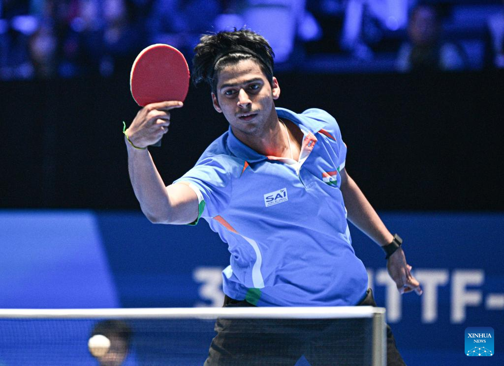 Snehit Suravajjula hits a return during the men's singles group match between Lin Shidong of China and Snehit Suravajjula of India at the ITTF-ATTU Asian Cup Haikou 2025 table tennis tournament in Haikou, south China's Hainan Province, Feb. 4, 2026. (Xinhua/Pu Xiaoxu)