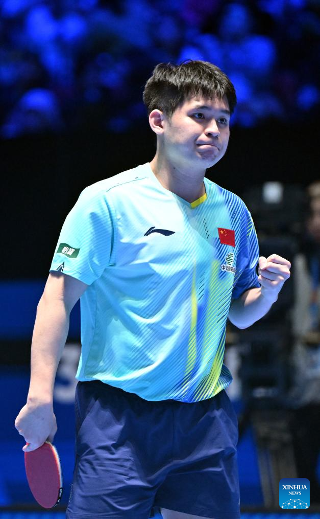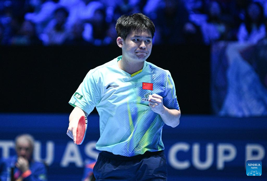 Lin Shidong reacts during the men's singles group match between Lin Shidong of China and Snehit Suravajjula of India at the ITTF-ATTU Asian Cup Haikou 2025 table tennis tournament in Haikou, south China's Hainan Province, Feb. 4, 2026. (Xinhua/Guo Cheng)