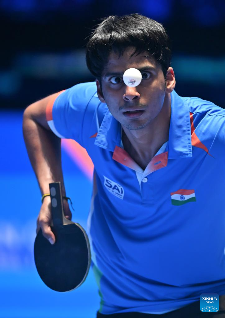 Snehit Suravajjula hits a return during the men's singles group match between Lin Shidong of China and Snehit Suravajjula of India at the ITTF-ATTU Asian Cup Haikou 2026 table tennis tournament in Haikou, south China's Hainan Province, Feb. 4, 2026. (Xinhua/Pu Xiaoxu)