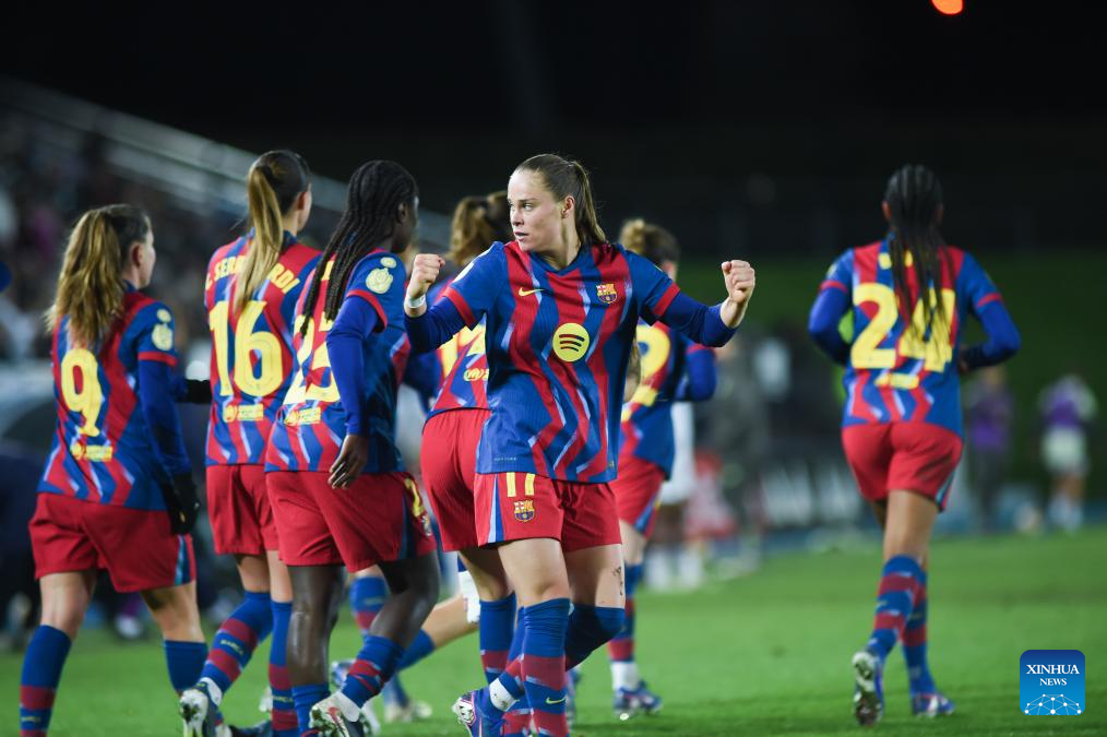 Ewa Pajor (C) of Barcelona celebrates her goal during the Copa de la Reina match between Real Madrid and FC Barcelona in Madrid, Spain, on Feb. 5, 2026. (Photo by Gustavo Valiente/Xinhua)