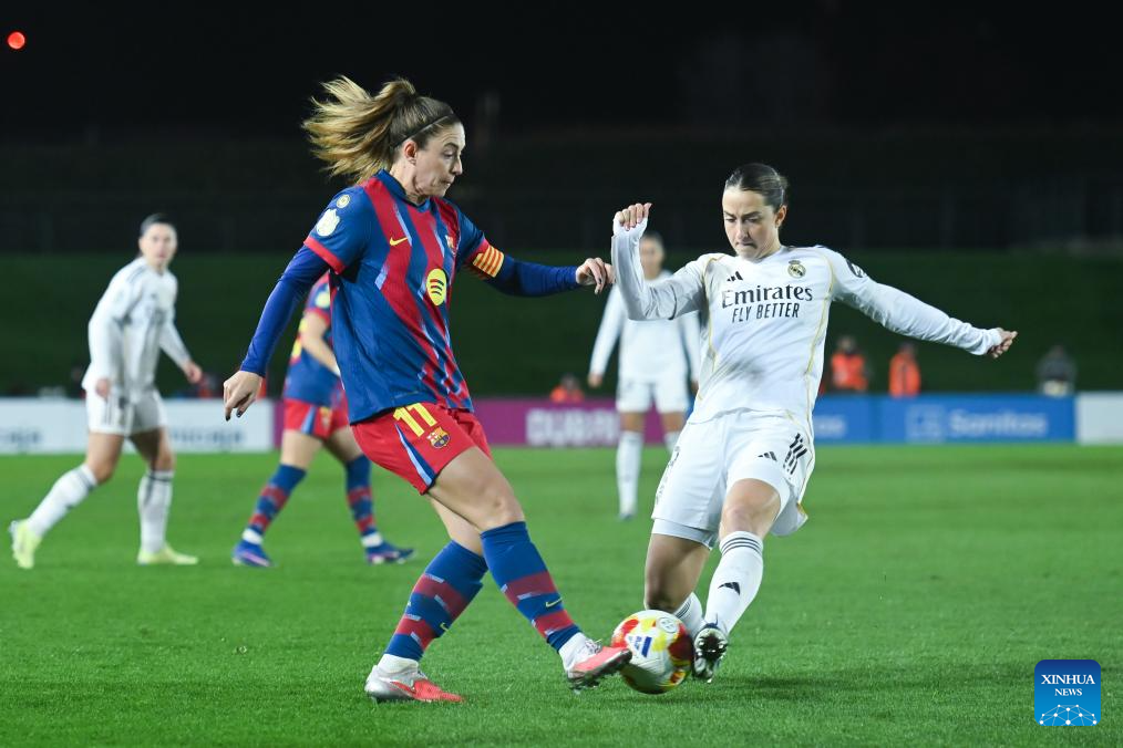 Sara Dabritz (R) of Real Madrid vies with Alexia Putellas of Barcelona during the Copa de la Reina match between Real Madrid and FC Barcelona in Madrid, Spain, on Feb. 5, 2026. (Photo by Gustavo Valiente/Xinhua)