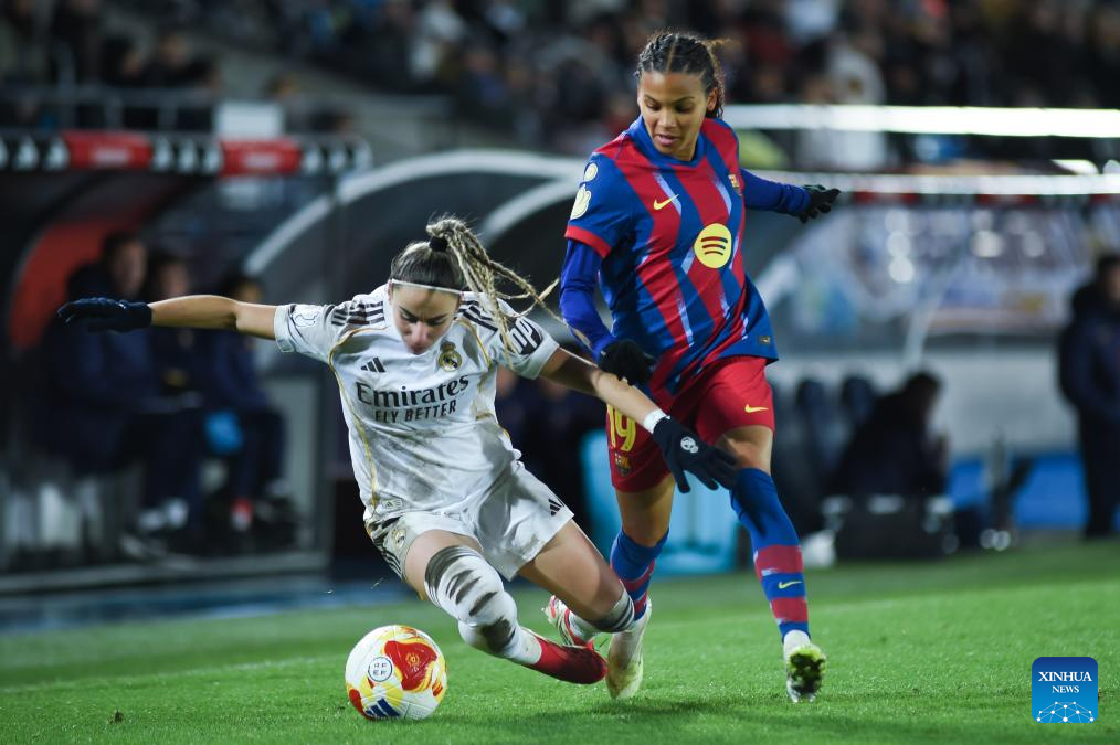 Linda Caceido (R) of Real Madrid vies with Vicky Lopez of Barcelona during the Copa de la Reina match between Real Madrid and FC Barcelona in Madrid, Spain, on Feb. 5, 2026. (Photo by Gustavo Valiente/Xinhua)
