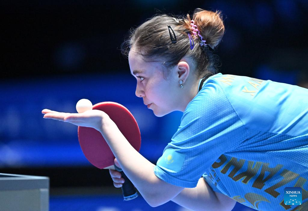Sarvinoz Mirkadirova serves during the women's singles group match between Wang Yidi of China and Sarvinoz Mirkadirova of Kazakhstan at the ITTF-ATTU Asian Cup Haikou 2026 table tennis tournament in Haikou, south China's Hainan Province, Feb. 6, 2026. (Xinhua/Guo Cheng)