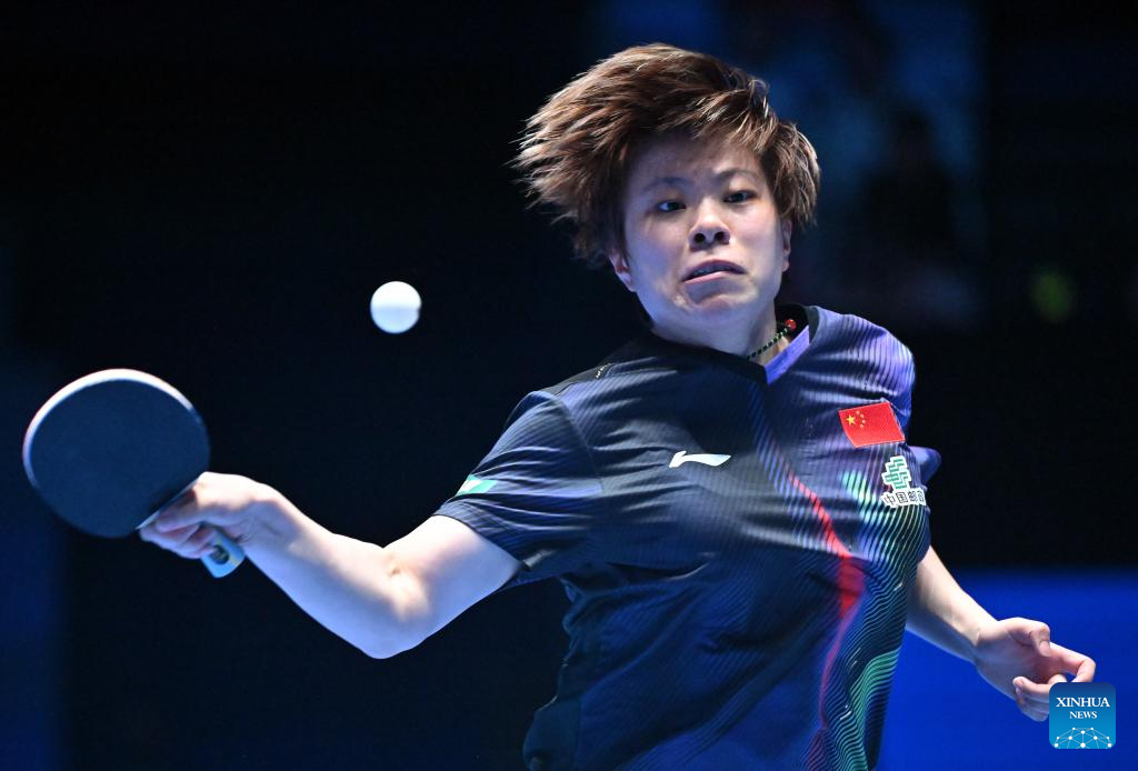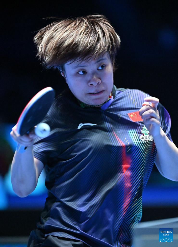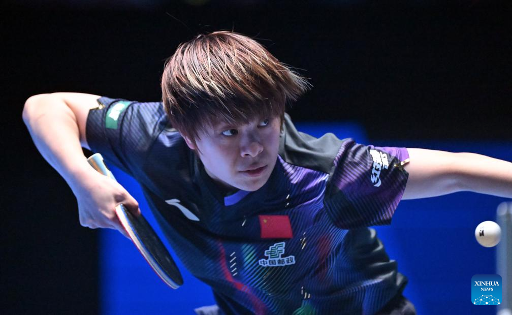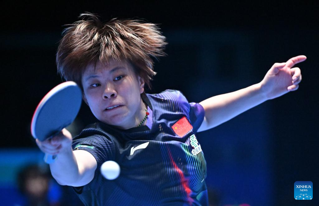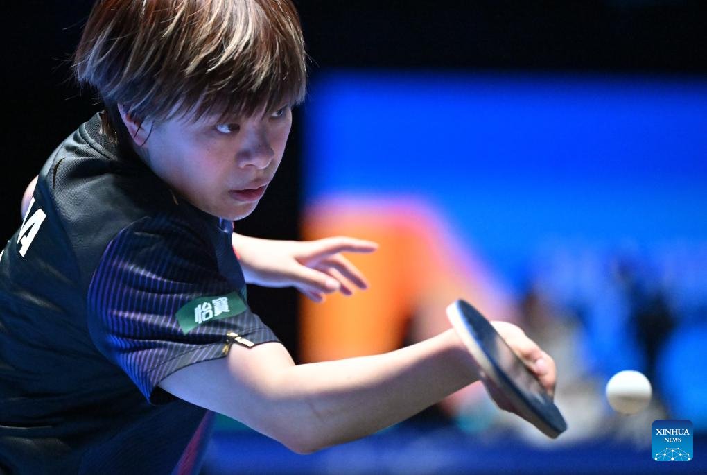Wang Yidi hits a return during the women's singles group match between Wang Yidi of China and Sarvinoz Mirkadirova of Kazakhstan at the ITTF-ATTU Asian Cup Haikou 2026 table tennis tournament in Haikou, south China's Hainan Province, Feb. 6, 2026. (Xinhua/Guo Cheng)