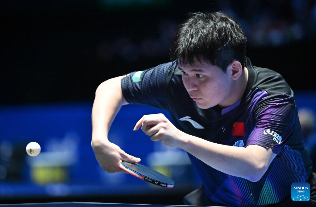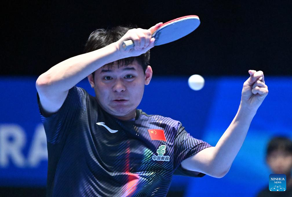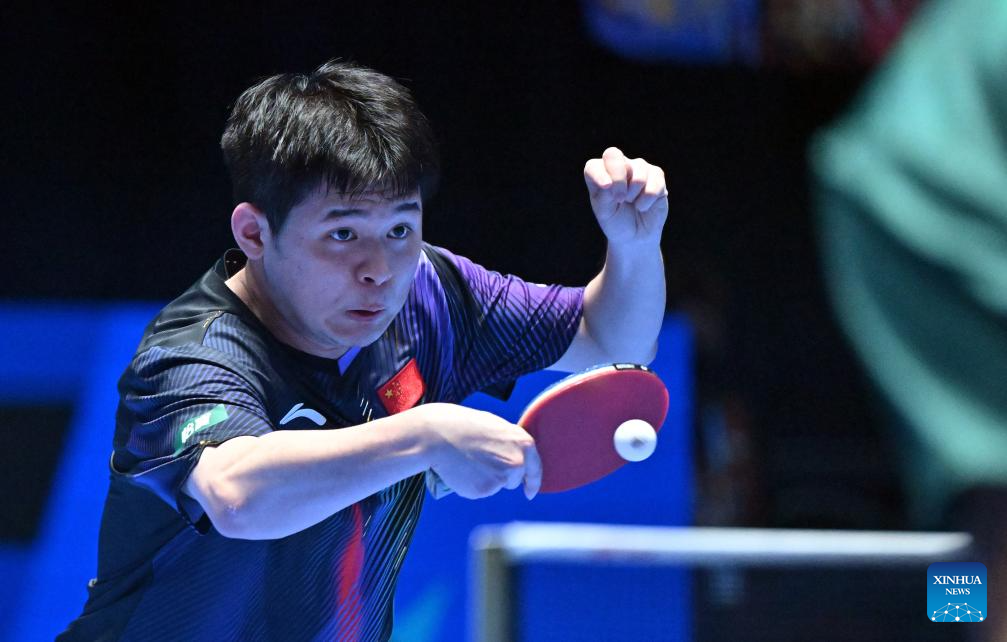 Lin Shidong hits a return during the men's singles group match between Lin Shidong of China and Abdulaziz Bu Shulaybi of Saudi Arabia at the ITTF-ATTU Asian Cup Haikou 2026 table tennis tournament in Haikou, south China's Hainan Province, Feb. 6, 2026. (Xinhua/Guo Cheng)