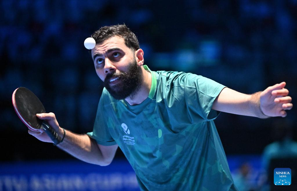 Abdulaziz Bu Shulaybi serves during the men's singles group match between Lin Shidong of China and Abdulaziz Bu Shulaybi of Saudi Arabia at the ITTF-ATTU Asian Cup Haikou 2026 table tennis tournament in Haikou, south China's Hainan Province, Feb. 6, 2026. (Xinhua/Guo Cheng)