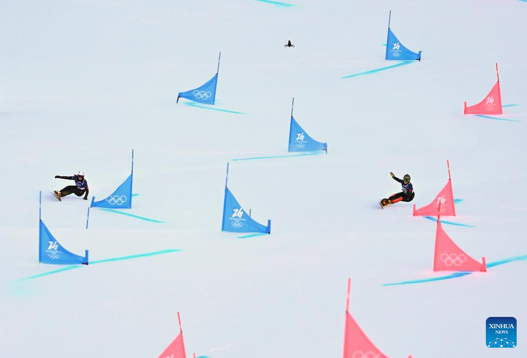 Xenia von Siebenthal (R) of Switzerland and Dong Yuyue of China compete during the Snowboard Women's Parallel Giant Slalom Qualification at the Milan-Cortina 2026 Olympic Winter Games in Livigno, Italy, Feb. 8, 2026. (Xinhua/Zhang Hongxiang)
