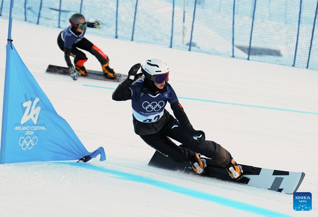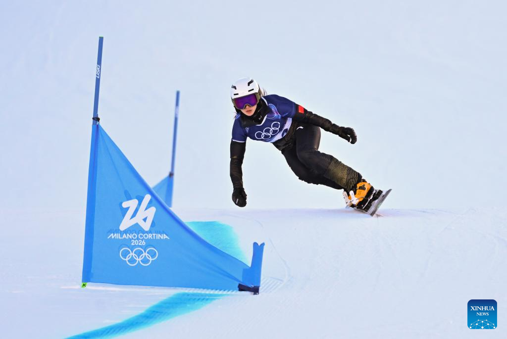 Dong Yuyue of China competes during the Snowboard Women's Parallel Giant Slalom Qualification at the Milan-Cortina 2026 Olympic Winter Games in Livigno, Italy, Feb. 8, 2026. (Xinhua/Zhang Hongxiang)