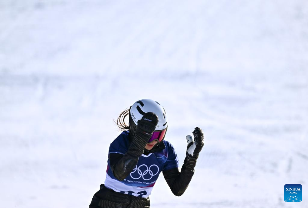 Bai Xinhui of China reacts during the Snowboard Women's Parallel Giant Slalom Qualification at the Milan-Cortina 2026 Olympic Winter Games in Livigno, Italy, Feb. 8, 2026. (Xinhua/Zhang Hongxiang)