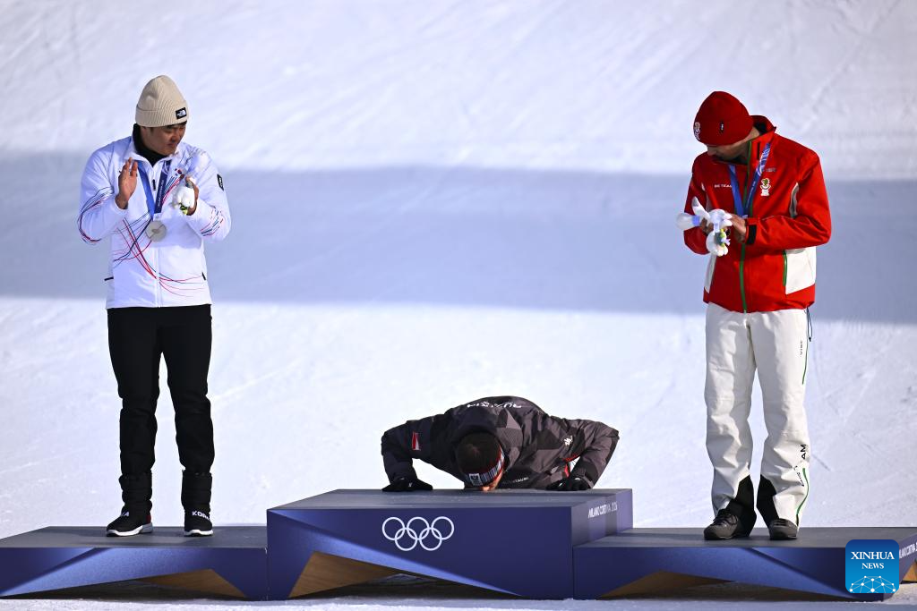 Gold medalist Benjamin Karl (C) of Austria kisses the podium during the awarding ceremony after the Snowboard Men's Parallel Giant Slalom final at the Milan-Cortina 2026 Olympic Winter Games in Livigno, Italy, Feb. 8, 2026. (Xinhua/Zhang Hongxiang)
