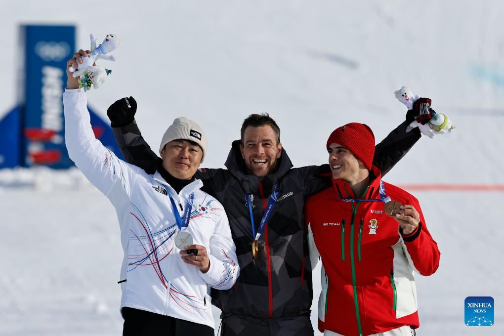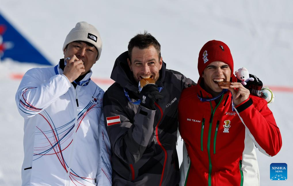Gold medalist Benjamin Karl (C) of Austria, silver medalist Kim Sangkyum (L) of South Korea and bronze medalist Tervel Zamfirov of Bulgaria pose on the podium after the Snowboard Men's Parallel Giant Slalom final at the Milan-Cortina 2026 Olympic Winter Games in Livigno, Italy, Feb. 8, 2026. (Xinhua/Wang Peng)