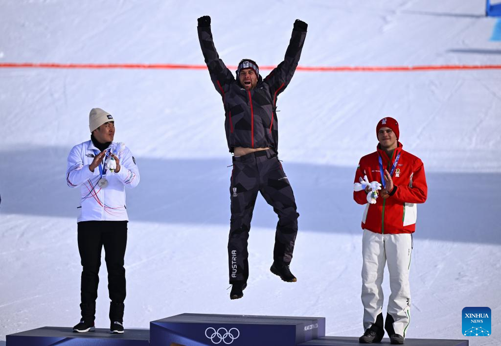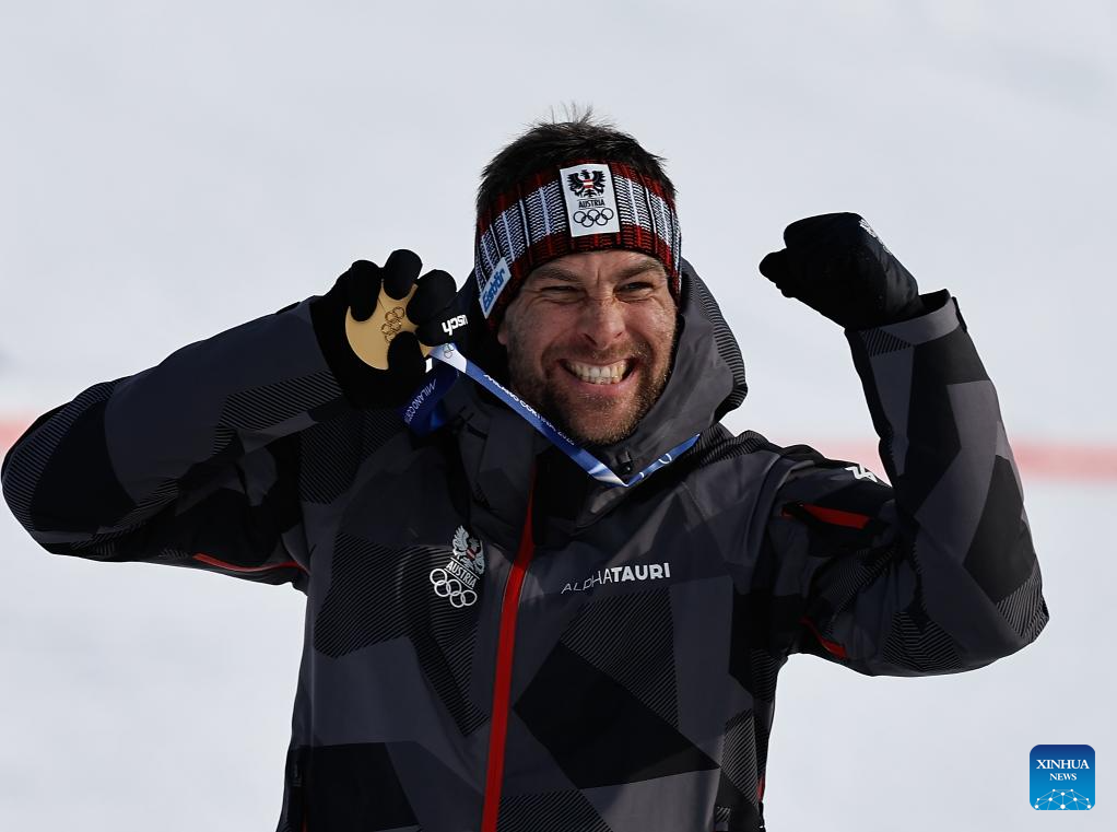 Gold medalist Benjamin Karl of Austria celebrates on the podium after the Snowboard Men's Parallel Giant Slalom final at the Milan-Cortina 2026 Olympic Winter Games in Livigno, Italy, Feb. 8, 2026. (Xinhua/Wang Peng)