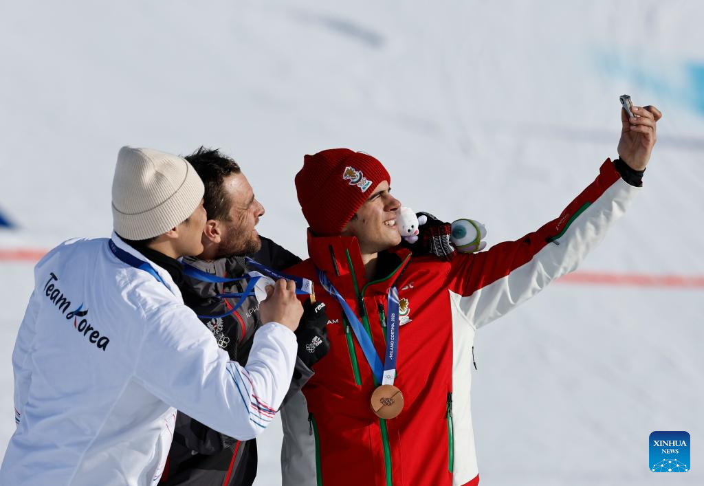 Gold medalist Benjamin Karl (C) of Austria, silver medalist Kim Sangkyum (L) of South Korea and bronze medalist Tervel Zamfirov of Bulgaria take selfies after the Snowboard Men's Parallel Giant Slalom final at the Milan-Cortina 2026 Olympic Winter Games in Livigno, Italy, Feb. 8, 2026. (Xinhua/Wang Peng)