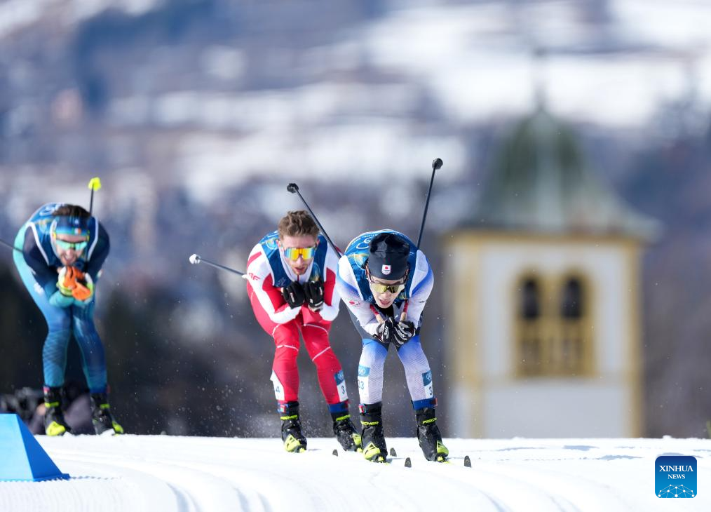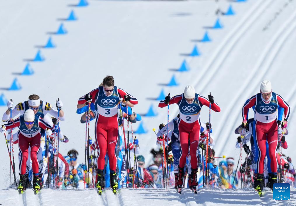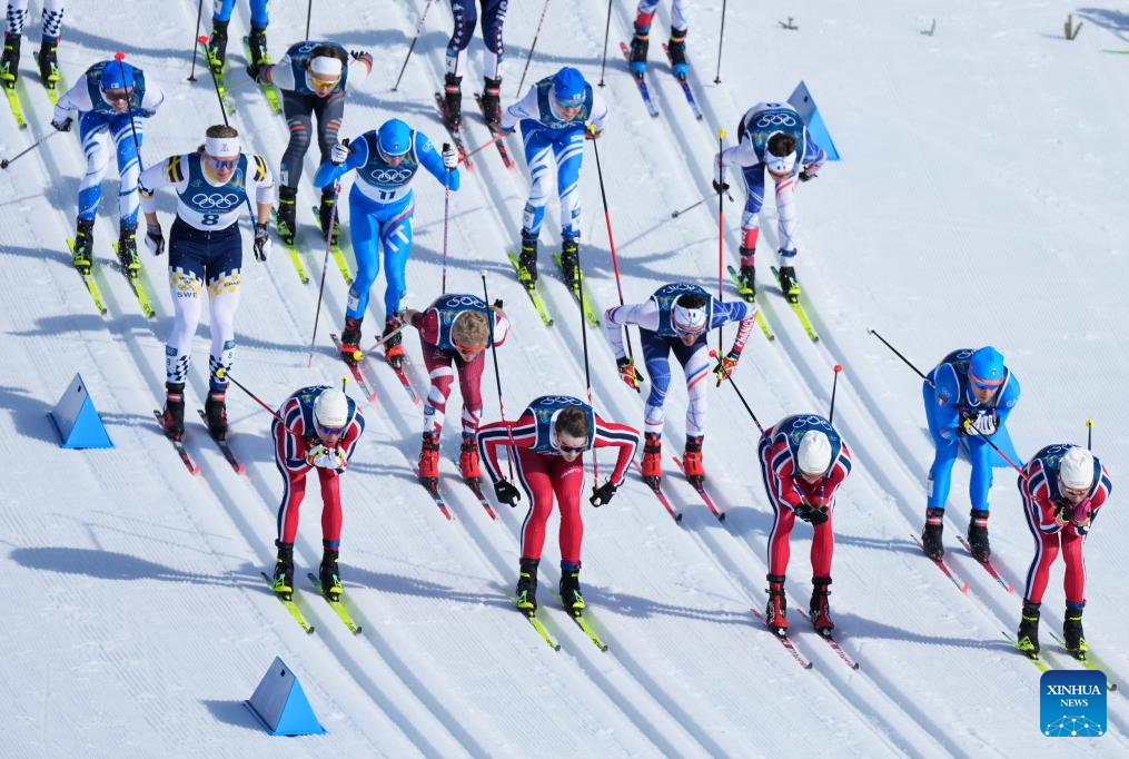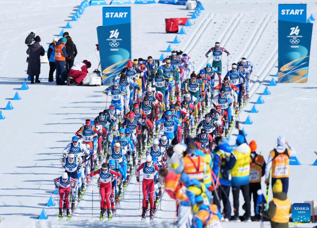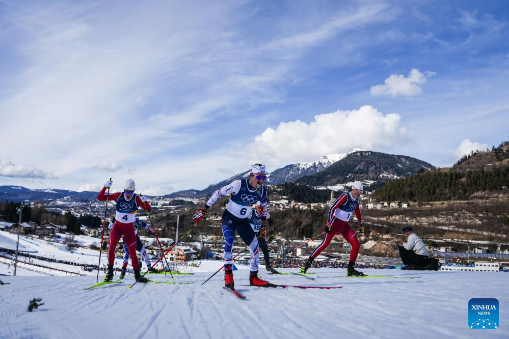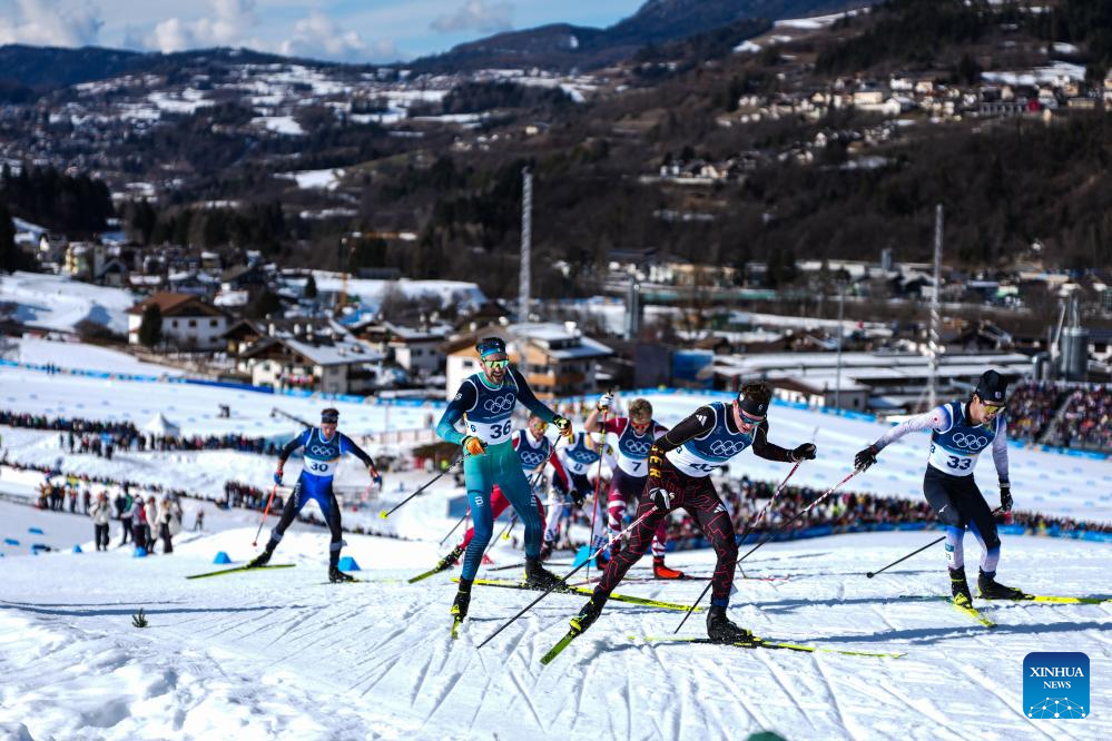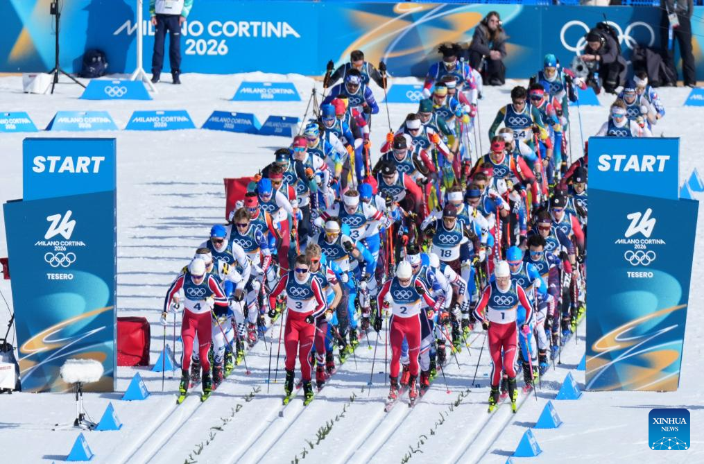 Athletes compete during the cross-country skiing men's 10km+10km skiathlon at the Milan-Cortina 2026 Olympic Winter Games in Tesero, Italy, Feb. 8, 2026. (Xinhua/He Canling)