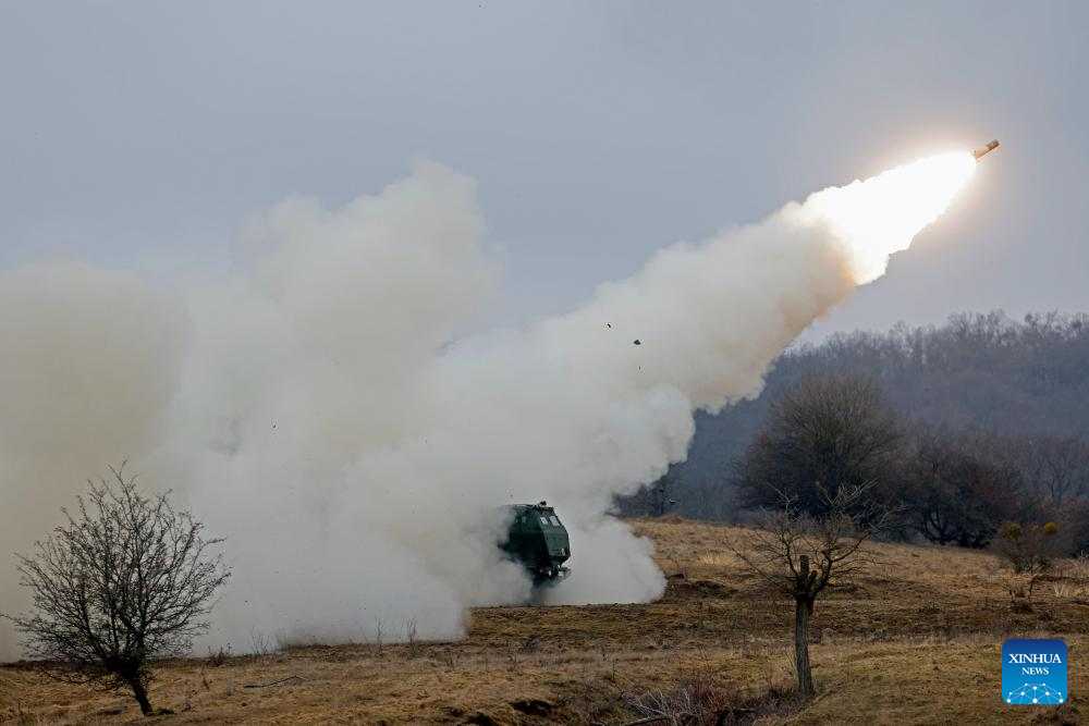 This photo shows a scene of the Dynamic Front 26 military exercise at the Cincu Training Area in Cincu, Brasov County, Romania, on Feb. 9, 2026. (Photo by Cristian Cristel/Xinhua)