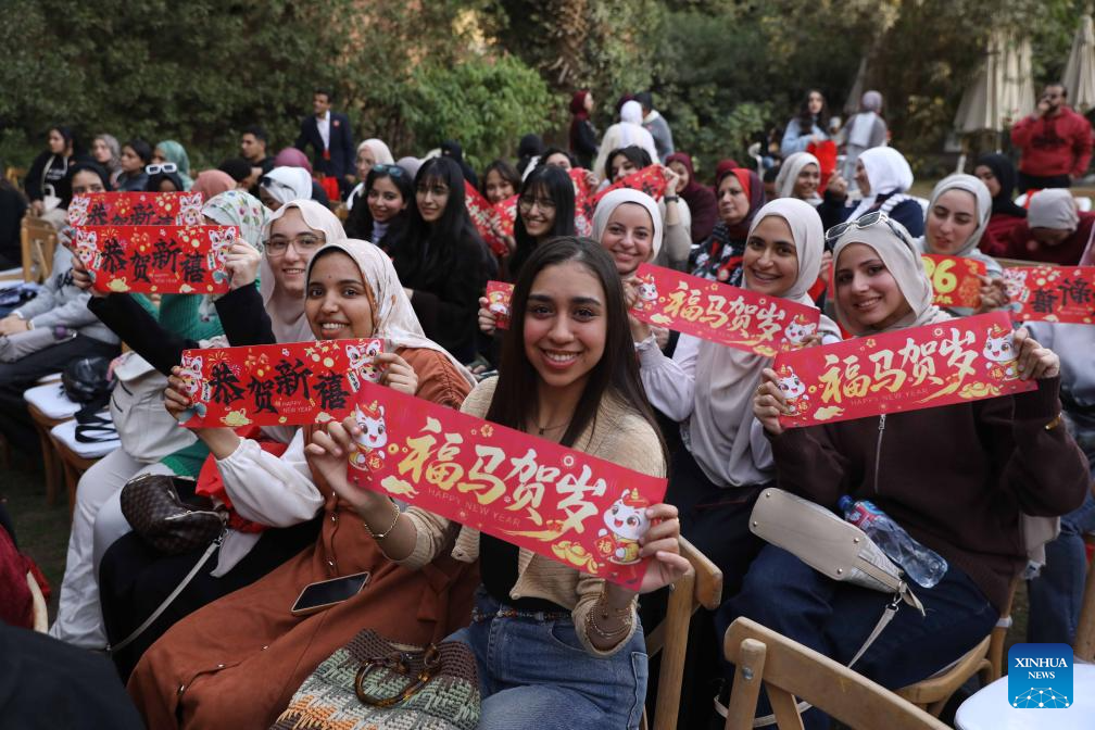 People pose for photos with Spring Festival decorations during a 2026 Chinese Spring Festival celebration in Cairo, Egypt, on Feb. 8, 2026. Cairo's Swiss Club hosted celebrations on Feb. 8 for the 2026 Chinese Spring Festival, welcoming the Year of the Horse with food, art and performances that drew nearly 1,000 Egyptians and more than 200 Chinese residents. (Xinhua/Ahmed Gomaa)