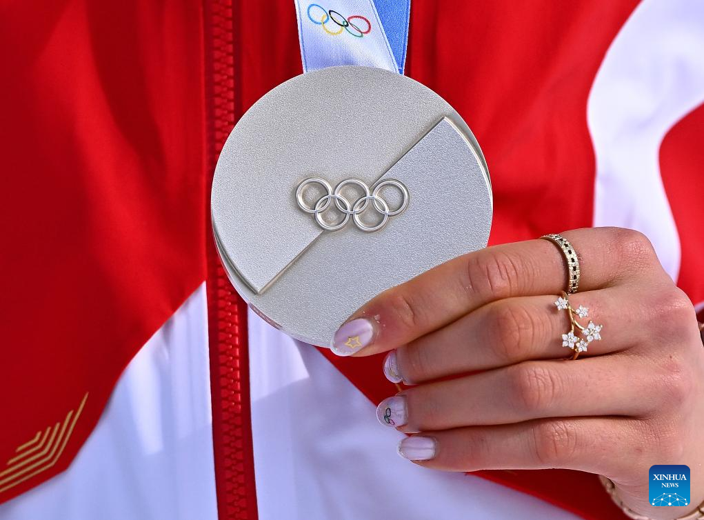 Silver medalist Gu Ailing of China displays her medal during the awarding ceremony for the freestyle skiing women's freeski slopestyle at the Milan-Cortina 2026 Olympic Winter Games in Livigno, Italy, Feb. 9, 2026. (Xinhua/Zhang Hongxiang)