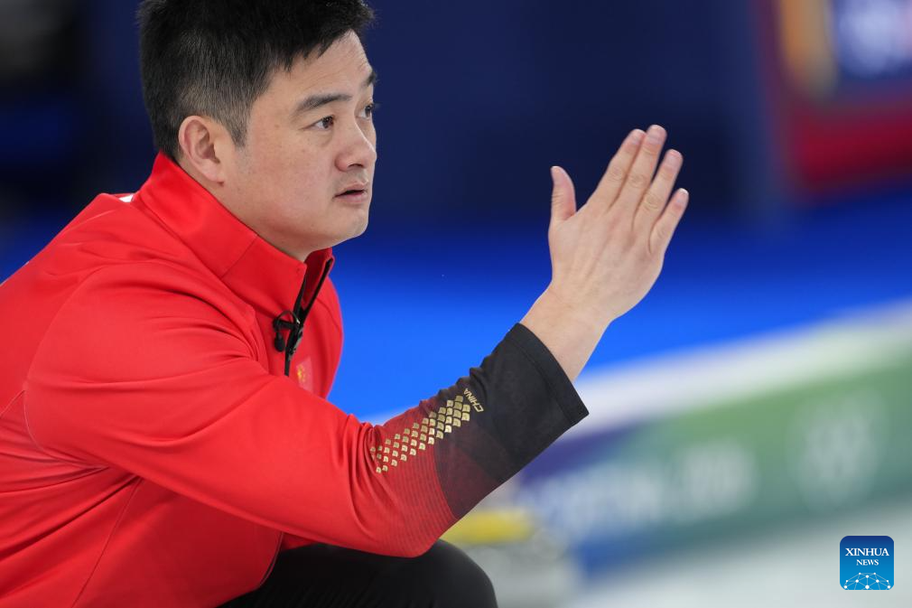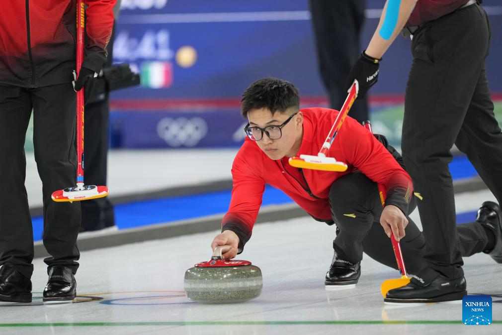 Xu Xiaoming (C) of China competes during the curling men round robin session 3 match between China and Norway at the Milan-Cortina 2026 Olympic Winter Games in Cortina, Italy, Feb. 13, 2026. (Xinhua/Li Gang)