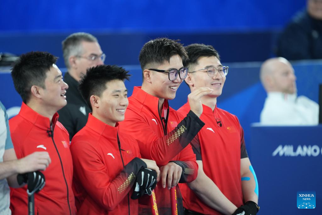 Xu Xiaoming, Fei Xueqing, Li Zhichao and Xu Jingtao (from L to R) of China react before the curling men round robin session 3 match between China and Norway at the Milan-Cortina 2026 Olympic Winter Games in Cortina, Italy, Feb. 13, 2026. (Xinhua/Li Gang)