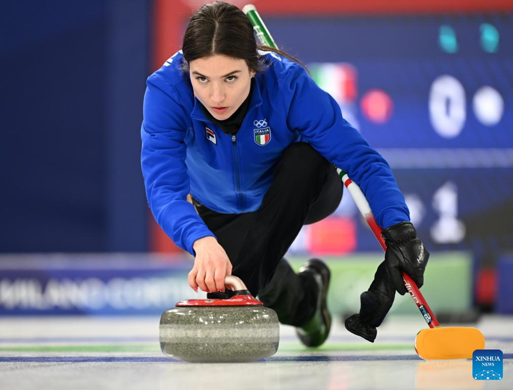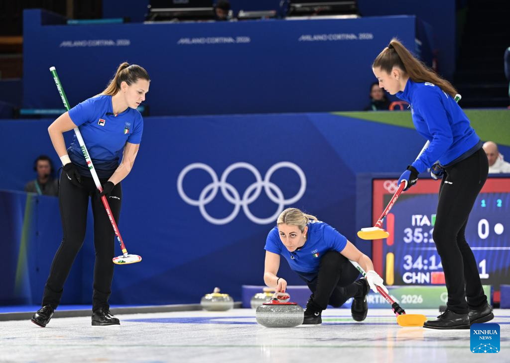 Elena Mathis (C) of Italy competes during the curling women round robin session 4 match between China and Italy at the 2026 Milan-Cortina Winter Olympics in Cortina, Italy, Feb. 14, 2026. (Xinhua/Lian Yi)