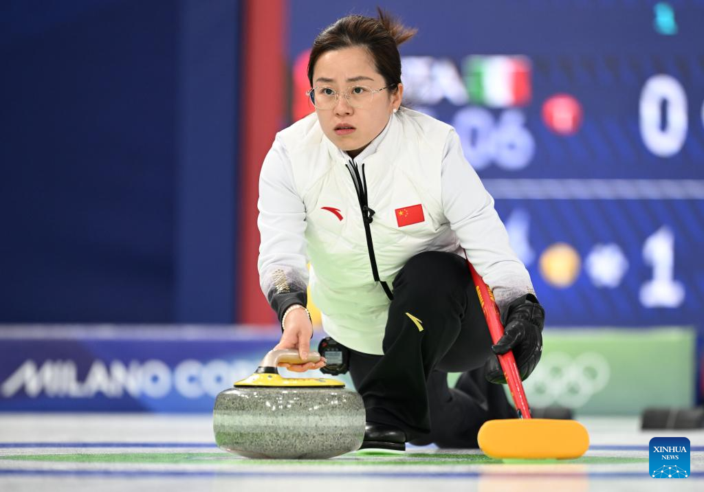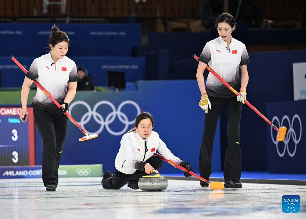 Wang Rui (C) of China competes during the curling women round robin session 4 match between China and Italy at the 2026 Milan-Cortina Winter Olympics in Cortina, Italy, Feb. 14, 2026. (Xinhua/Lian Yi)
