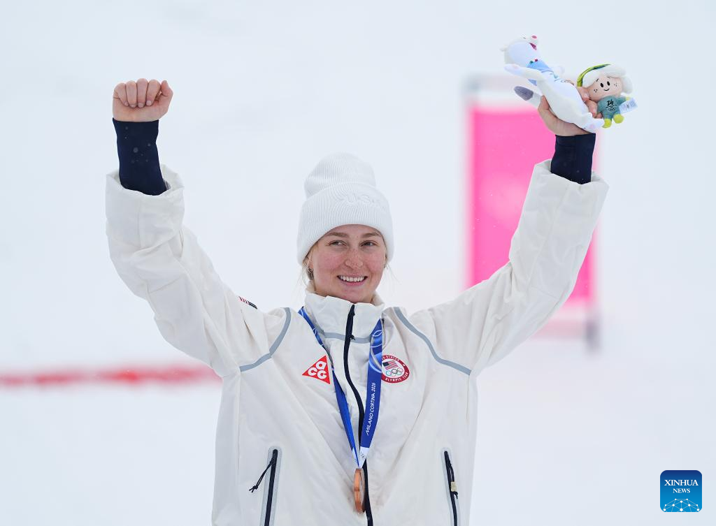 Bronze medalist Elizabeth Lemley of the United States poses for photos during the awarding ceremony for the freestyle skiing women's dual moguls at the Milan-Cortina 2026 Olympic Winter Games in Livigno, Italy, Feb. 14, 2026. (Xinhua/Wu Huiwo)