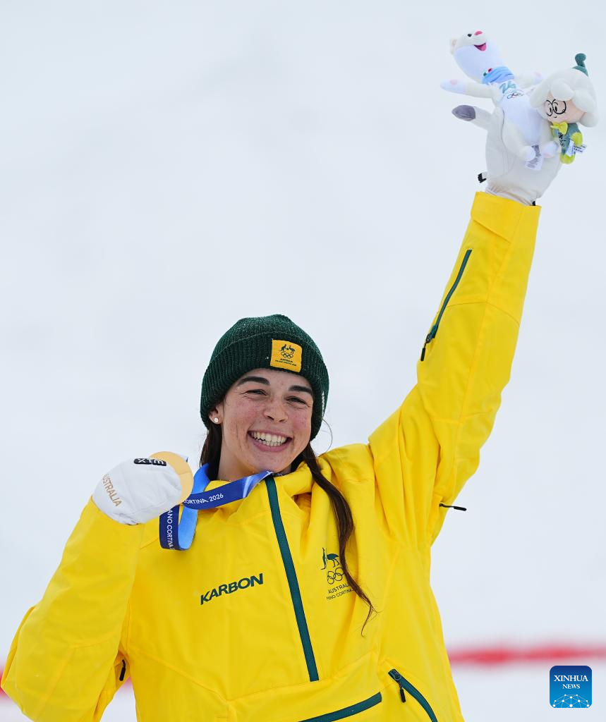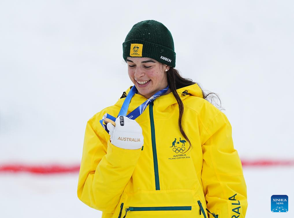 Gold medalist Jakara Anthony of Australia poses for photos with the medal during the awarding ceremony for the freestyle skiing women's dual moguls at the Milan-Cortina 2026 Olympic Winter Games in Livigno, Italy, Feb. 14, 2026. (Xinhua/Wu Huiwo)