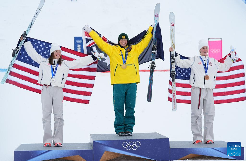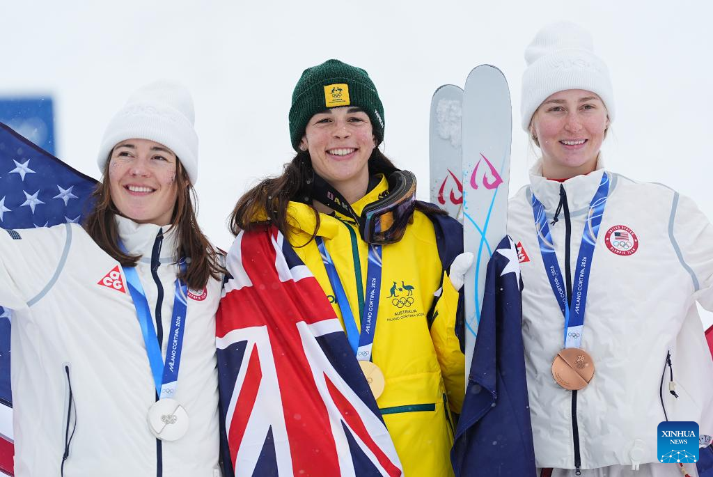 Gold medalist Jakara Anthony (C) of Australia, silver medalist Jaelin Kauf (L) of the United States and bronze medalist Elizabeth Lemley of the United States pose for photos during the awarding ceremony for the freestyle skiing women's dual moguls at the Milan-Cortina 2026 Olympic Winter Games in Livigno, Italy, Feb. 14, 2026. (Xinhua/Wu Huiwo)