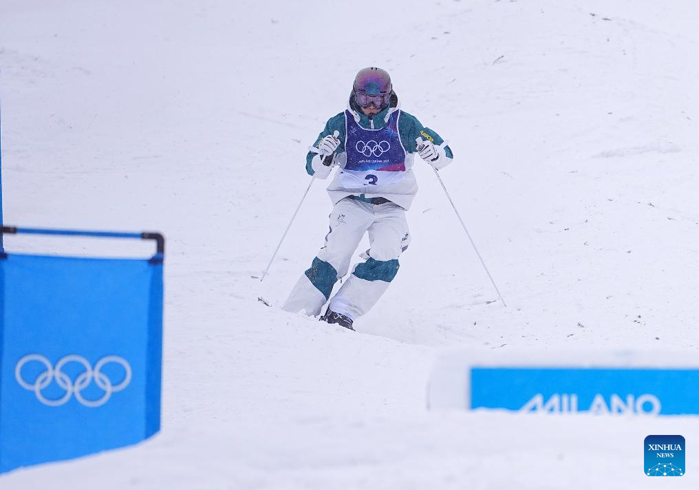 Jakara Anthony of Australia competes during the freestyle skiing women's dual moguls big final at the Milan-Cortina 2026 Olympic Winter Games in Livigno, Italy, Feb. 14, 2026. (Xinhua/Wu Huiwo)