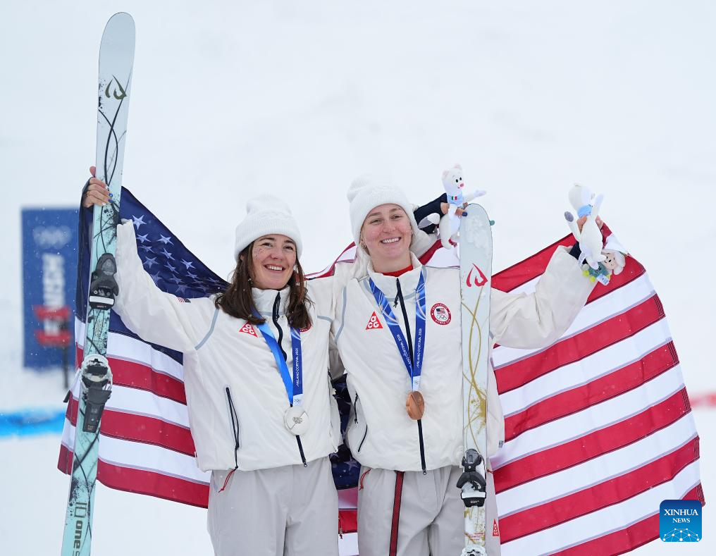 Silver medalist Jaelin Kauf (L) of the United States and bronze medalist Elizabeth Lemley of the United States pose for photos during the awarding ceremony for the freestyle skiing women's dual moguls at the Milan-Cortina 2026 Olympic Winter Games in Livigno, Italy, Feb. 14, 2026. (Xinhua/Wu Huiwo)