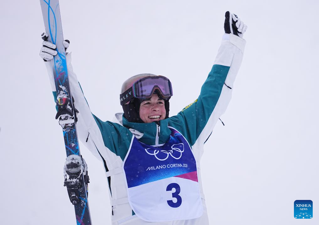 Jakara Anthony of Australia celebrates after winning the freestyle skiing women's dual moguls big final at the Milan-Cortina 2026 Olympic Winter Games in Livigno, Italy, Feb. 14, 2026. (Xinhua/Wu Huiwo)