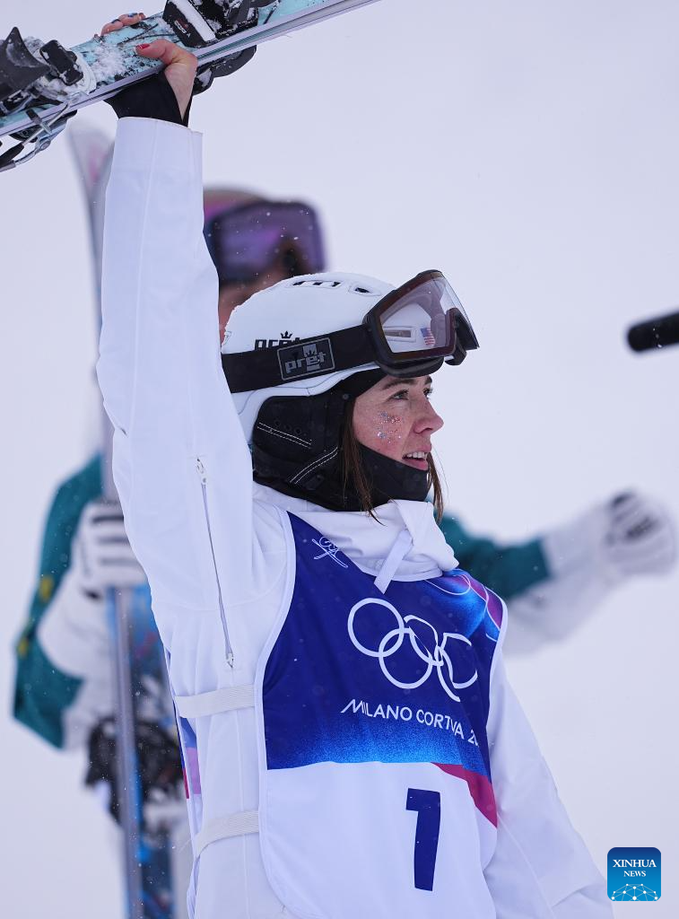 Jaelin Kauf of the United States celebrates after the freestyle skiing women's dual moguls big final at the Milan-Cortina 2026 Olympic Winter Games in Livigno, Italy, Feb. 14, 2026. (Xinhua/Wu Huiwo)