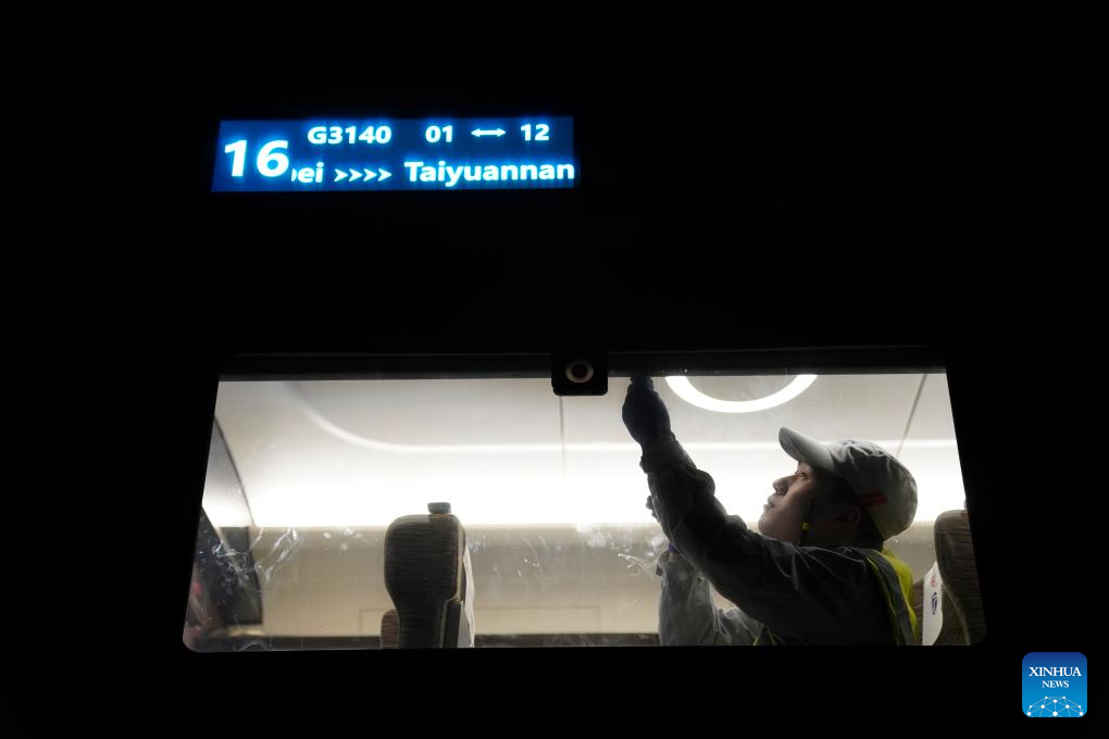 A service mechanic repairs a curtain aboard a bullet train at a train depot in Yuci, north China's Shanxi Province, Feb. 13, 2026.