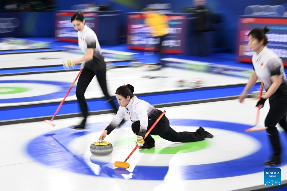 Han Yu (C) of China competes during the curling women round robin session 6 match between China and the United States at the 2026 Milan-Cortina Winter Olympics in Cortina, Italy, Feb. 15, 2026. (Xinhua/Lian Yi)