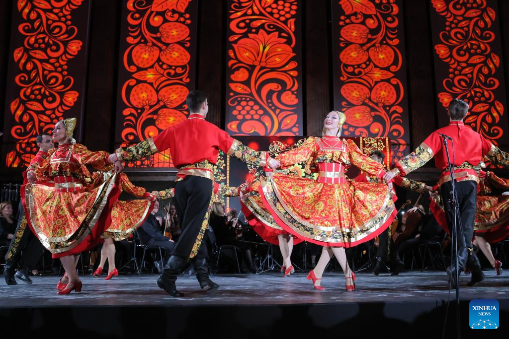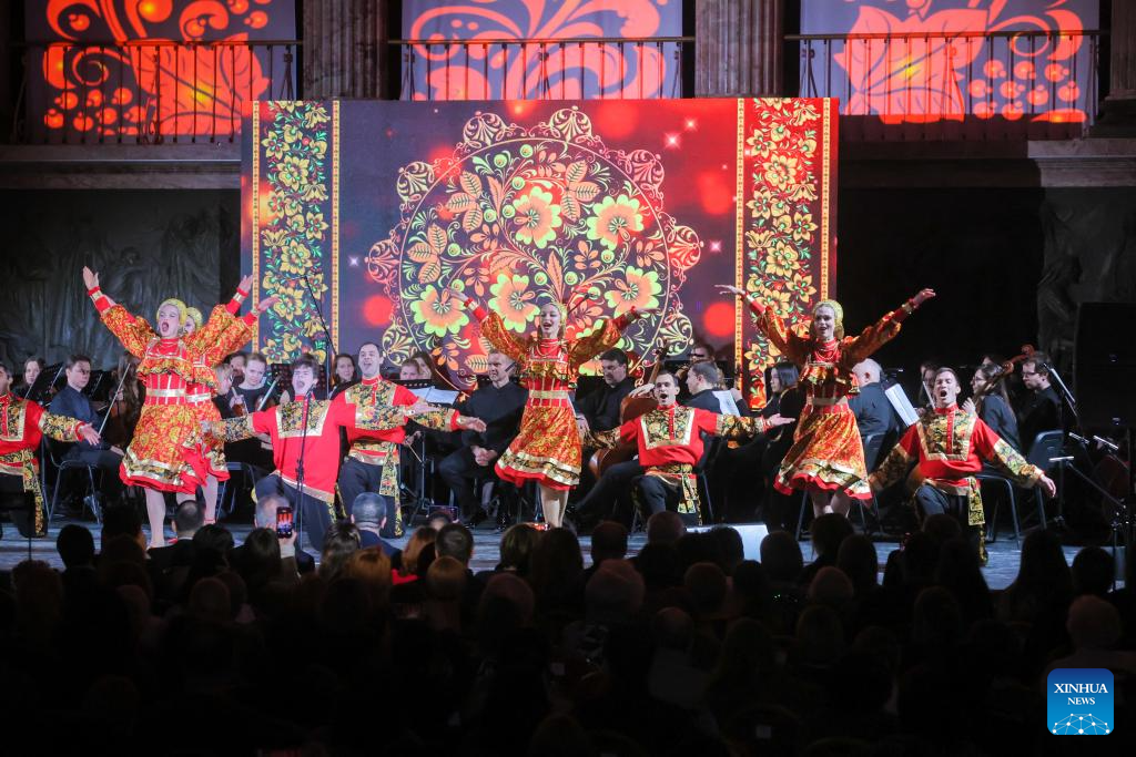 Russian dancers perform during a concert staged to celebrate the Chinese New Year in St. Petersburg, Russia, Feb. 15, 2026. (Photo by Irina Motina/Xinhua)