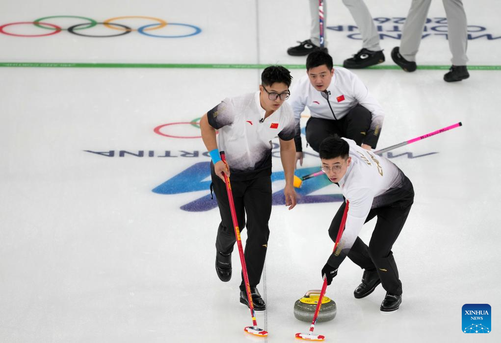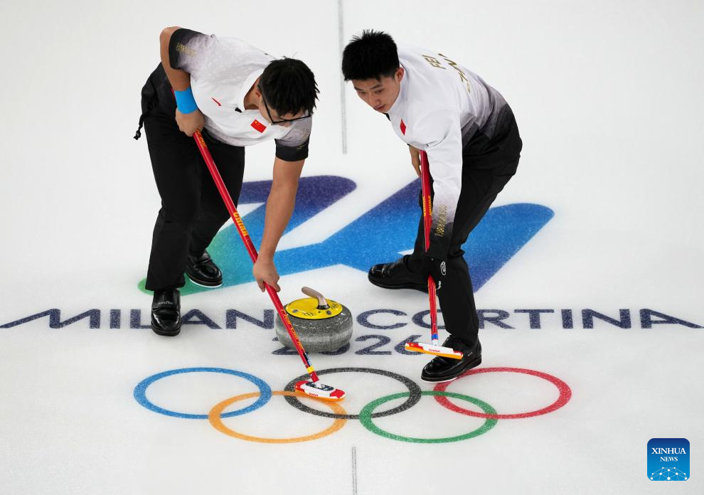 Li Zhichao (L) and Fei Xueqing of China compete during the curling men's round robin session 9 match between China and the United States at the 2026 Milan-Cortina Winter Olympics in Cortina, Italy, Feb. 17, 2026. (Xinhua/Li Gang)