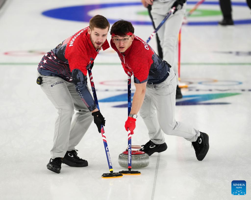 Ben Richardson (L) and Aidan Oldenburg (R) of the United States compete during the curling men's round robin session 9 match between China and the United States at the 2026 Milan-Cortina Winter Olympics in Cortina, Italy, Feb. 17, 2026. (Xinhua/Li Gang)