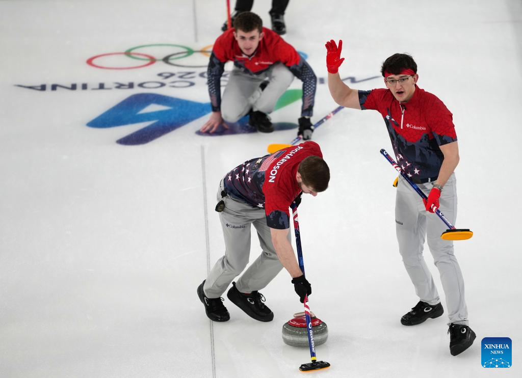 Ben Richardson, Daniel Casper and Aidan Oldenburg (L-R) of the United States compete during the curling men's round robin session 9 match between China and the United States at the 2026 Milan-Cortina Winter Olympics in Cortina, Italy, Feb. 17, 2026. (Xinhua/Li Gang)