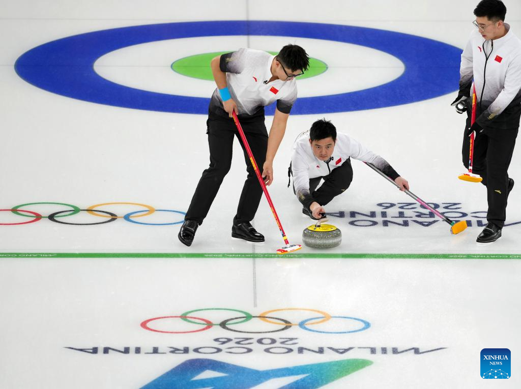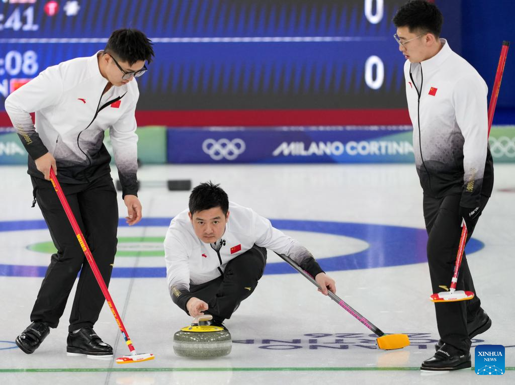 Li Zhichao, Xu Xiaoming and Xu Jingtao (L-R) of China compete during the curling men's round robin session 9 match between China and the United States at the 2026 Milan-Cortina Winter Olympics in Cortina, Italy, Feb. 17, 2026. (Xinhua/Li Gang)