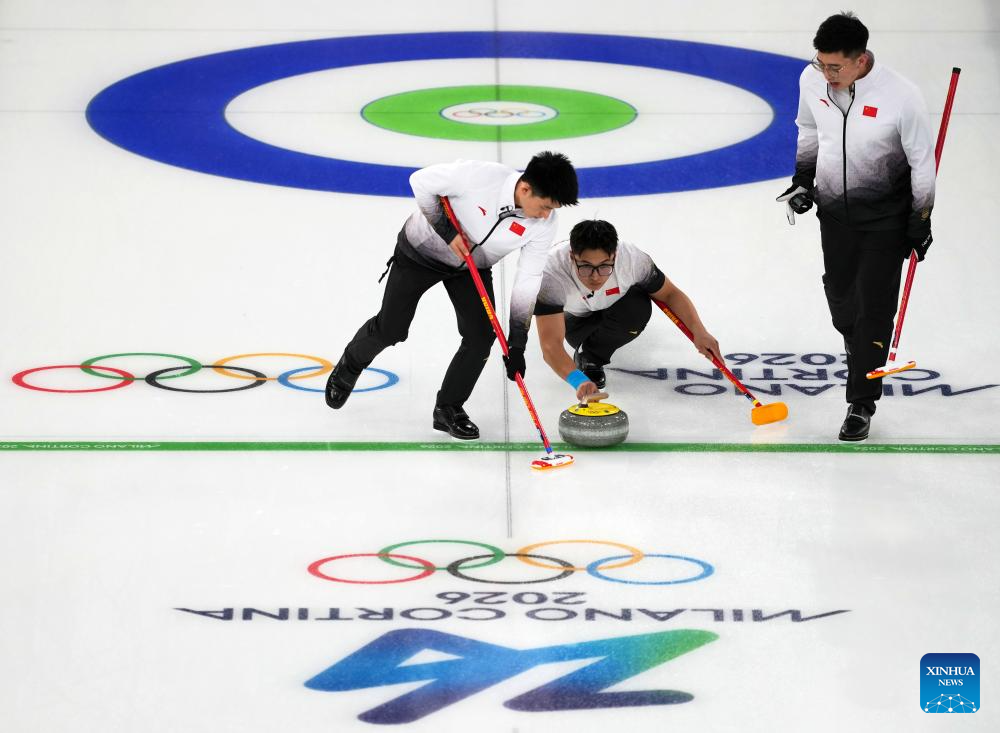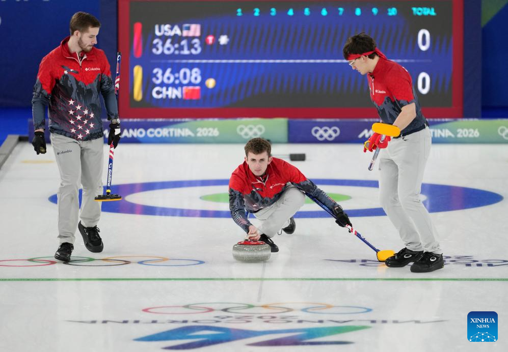 Fei Xueqing, Li Zhichao and Xu Jingtao (L-R) of China compete during the curling men's round robin session 9 match between China and the United States at the 2026 Milan-Cortina Winter Olympics in Cortina, Italy, Feb. 17, 2026. (Xinhua/Li Gang)