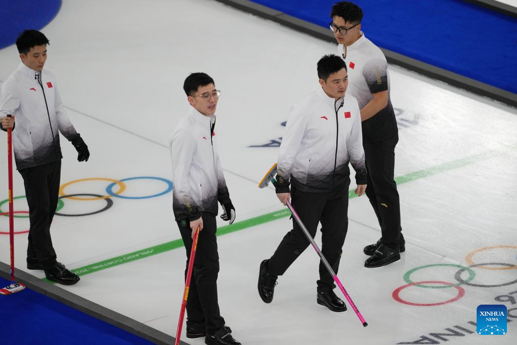 Fei Xueqing, Xu Jingtao, Xu Xiaoming and Li Zhichao (L-R) of China are seen during the curling men's round robin session 9 match between China and the United States at the 2026 Milan-Cortina Winter Olympics in Cortina, Italy, Feb. 17, 2026. (Xinhua/Li Gang)