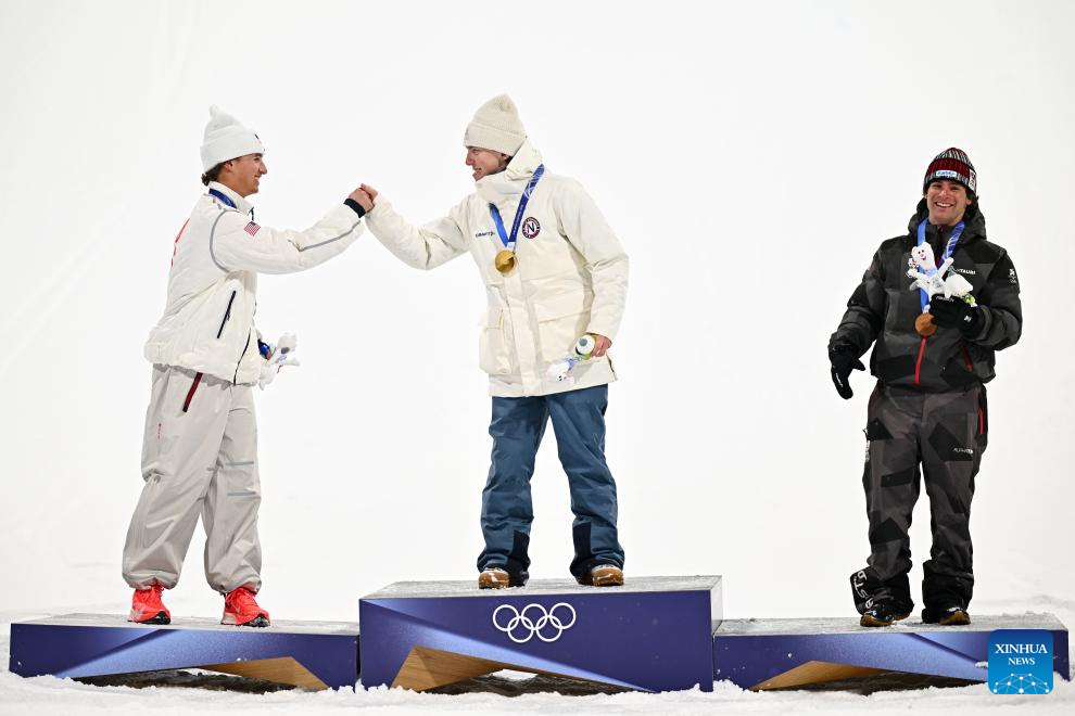 Gold medalist Tormod Frostad (C) of Norway greets with silver medalist Mac Forehand (L) of the United States as bronze medalist Matej Svancer of Austria looks on during the victory ceremony for Freestyle Skiing Men's Freeski Big Air at the Milan-Cortina 2026 Olympic Winter Games in Livigno, Italy, Feb. 17, 2026. (Xinhua/Zhang Hongxiang)