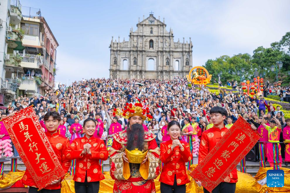 A performer dressed as the "God of Wealth" (C) extends greetings to the crowd during a celebration of the Spring Festival in front of the Ruins of St. Paul's in south China's Macao, Feb. 18, 2026. (Xinhua/Cheong Kam Ka)