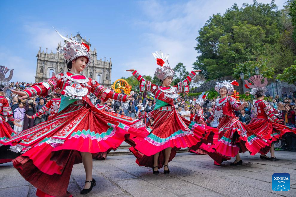 Dancers from southwest China's Guizhou Province perform during a celebration of the Spring Festival in front of the Ruins of St. Paul's in south China's Macao, Feb. 18, 2026. (Xinhua/Cheong Kam Ka)