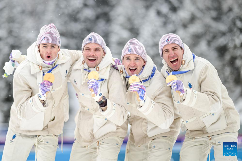 Gold medalists Eric Perrot, Quentin Fillon Maillet, Emilien Jacquelin and Fabien Claude of France pose for photos during the awarding ceremony of the biathlon men's 4x7.5km relay at the 2026 Milan-Cortina Winter Olympics in Anterselva, Italy, Feb. 17, 2026. (Xinhua/Jiang Han)