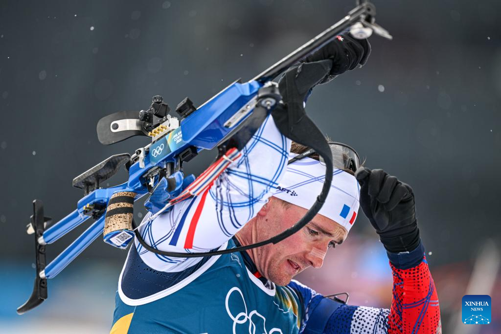 Eric Perrot of France crosses the finish line during the biathlon men's 4x7.5km relay at the 2026 Milan-Cortina Winter Olympics in Anterselva, Italy, Feb. 17, 2026. (Xinhua/Jiang Han)