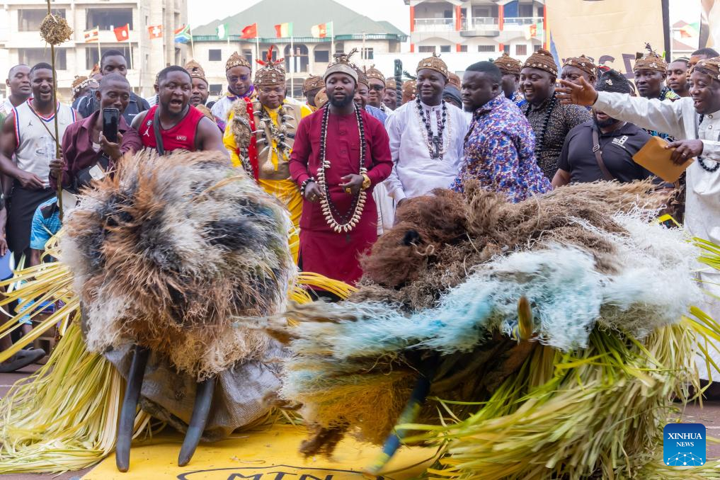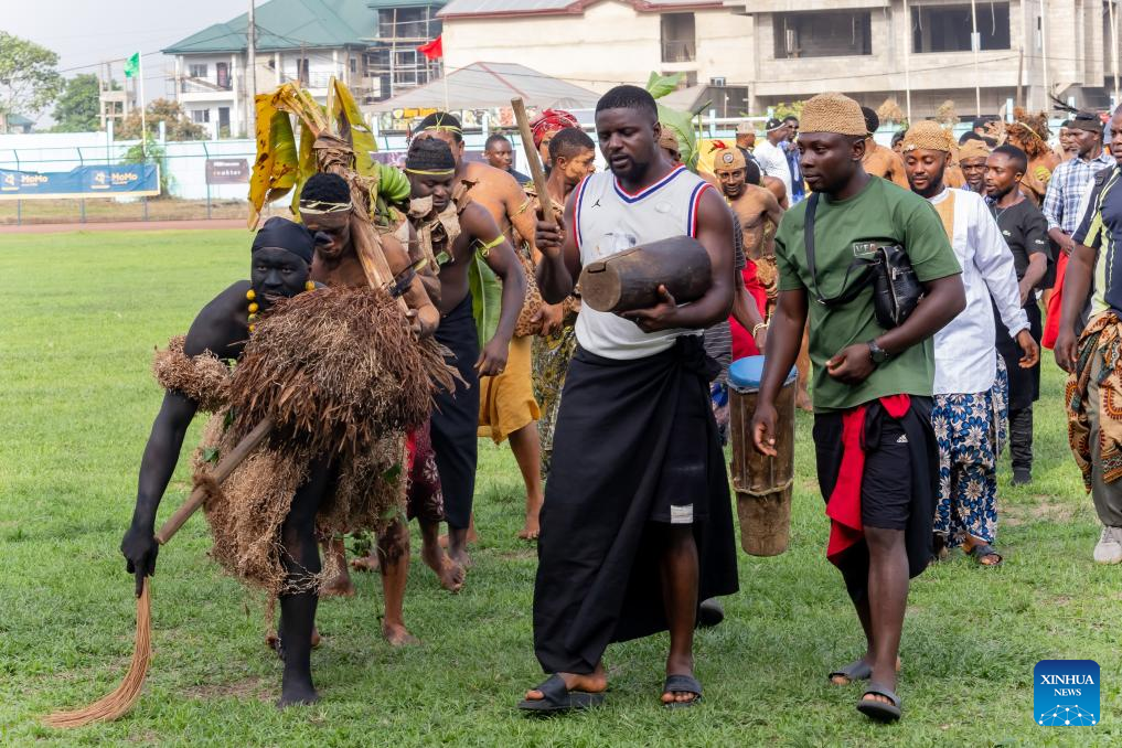 Performers showcase traditional cultural displays during the opening ceremony of the 31st edition of the Mount Cameroon Race in Buea, Cameroon, Feb. 21, 2026. The race opened under the theme "Give peace a chance", drawing 600 athletes from 14 countries and regions. (Photo by Muleng Timngum/Xinhua)